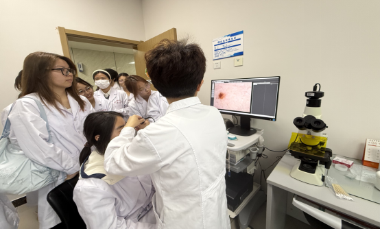 随后,刘主任使用皮肤镜现场为一名学生进行皮肤状况检测,一边操作一边讲解检测要点与皮肤状态分析,将抽象的医学知识转化为具象的临床实操,让同学们近距离感受临床诊疗的严谨性与专业性。