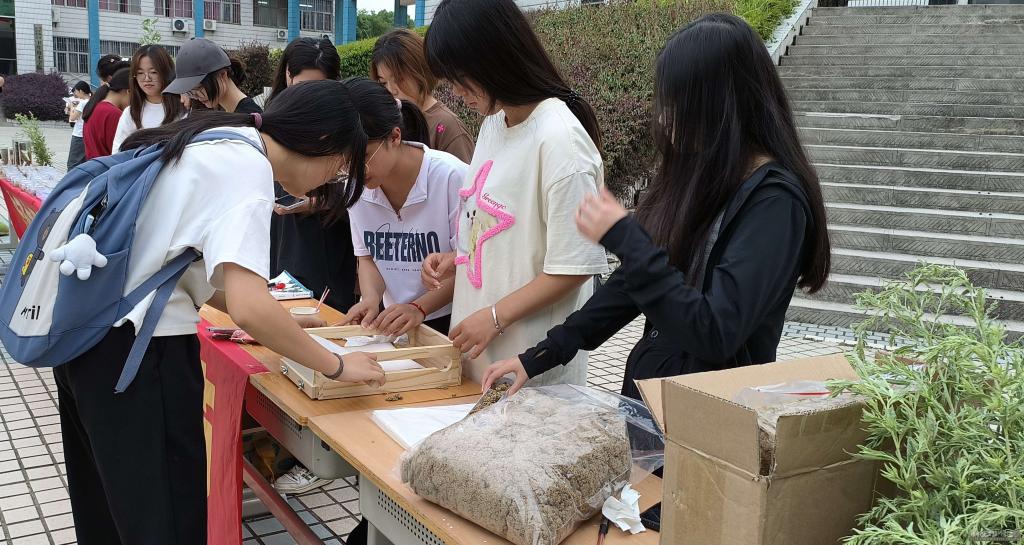 活动当天下午,在球友会立德广场前,球友会师生们现场展示了自制的中药饮片、立体标本相框和蜡叶标本,并指导前来参加活动的老师及同学自己动手制作艾条和香囊,新鲜采摘的艾叶飘来阵阵药香,伴随着药香大家挑选着喜爱的香囊造型,再装上球友会师生自制的驱虫中药香包,一个个漂亮的香囊就制作完成了,艾草和香囊混合的芬芳气息,引得不少路过的师生驻足参观。现场还有身着汉服的女同学前来围观,为活动增色不少。