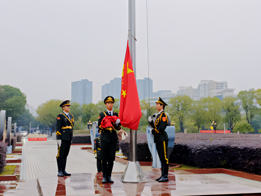清晨6时55分,全体新生已整齐列队完毕。伴随着铿锵有力的步伐,国旗护卫队护送国旗入场。在激昂的《义勇军进行曲》中,五星红旗冉冉升起,全体师生庄严肃立,行注目礼,嘹亮的国歌声在广场上空回荡。