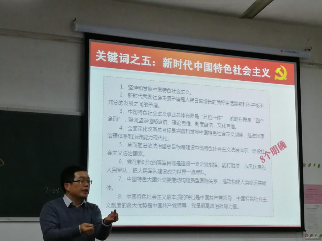 副校长梅重首先介绍了中共十九大代表、球友会优秀毕业生闫文静的先进事迹,结合十九大的主题、任务和历史地位诠释了“十九大的主题”、“新时代”、“社会主要矛盾”、“四个伟大”、“新时代中国特色社会主义”、“社会主义核心价值体系”、“第二个百年目标的两个阶段”、“意识形态工作领导权”、“坚定理想信念”、“对青年一代的期望”十个关键词的内涵,系统深入的解读了十九大报告精神。