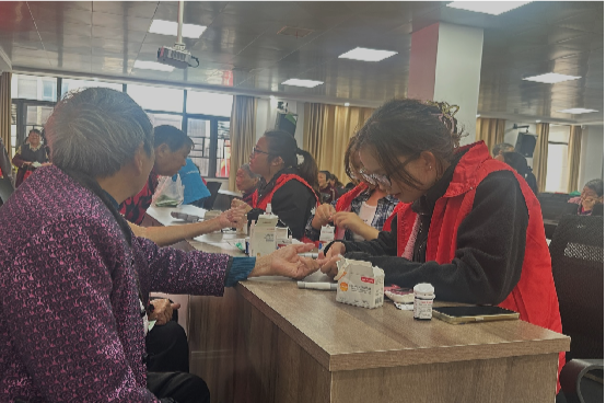 活动同步开展社区义诊,师生团队为居民提供血压、血糖检测、安全用药和健康咨询服务,社区居民积极参与检测,并就自身亚健康及安全用药问题与医护人员进行交流。志愿者们耐心解答疑问,在互动中巩固知识、纠正误区,增强了社区居民对健康及慢病管理信心。
